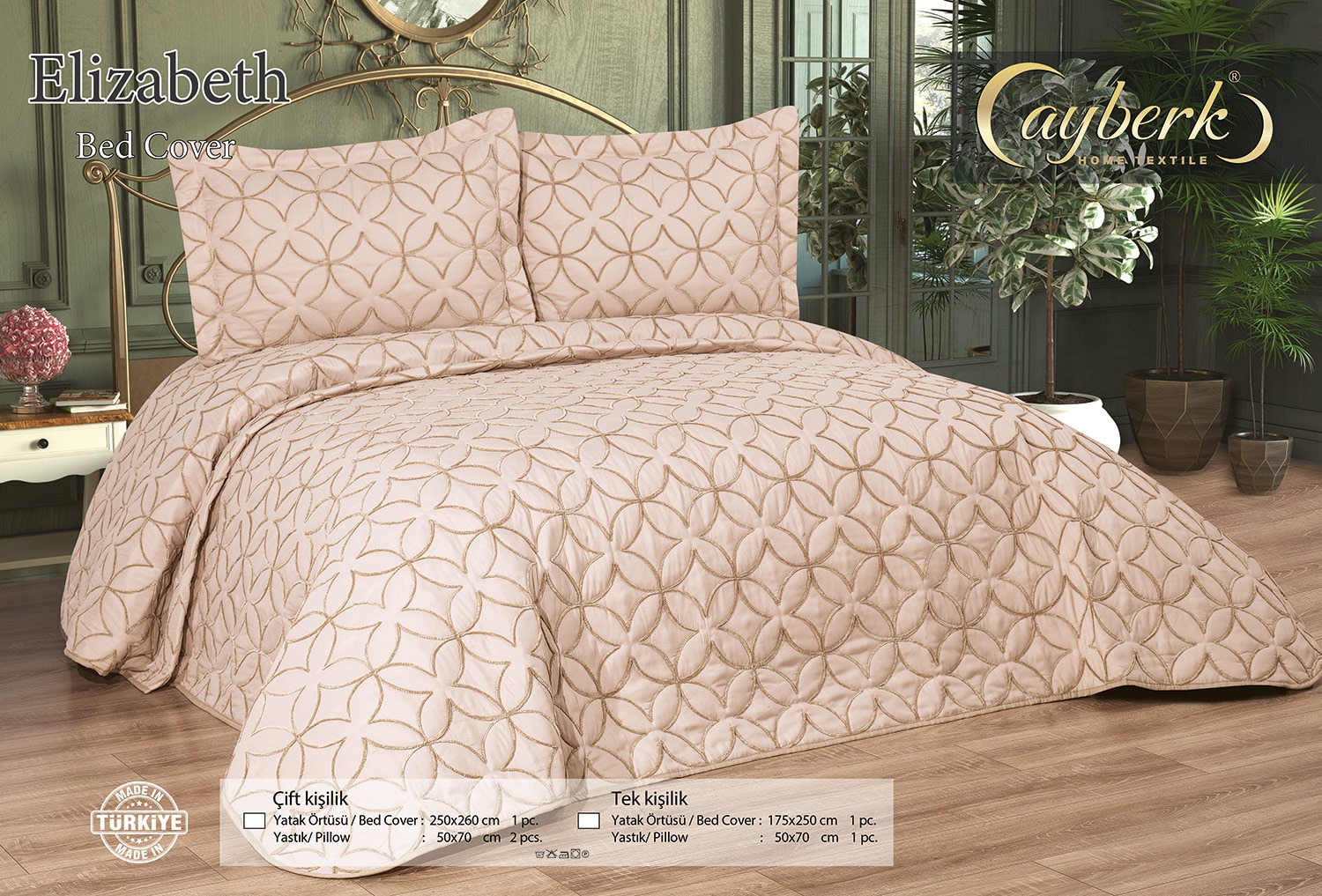 Elizabeth Yatak Örtüsü Kadife Nakışlı Pamuk Kumaştan Üretilmiştir. YATAK ÖRTÜSÜ: 250*260cm 1 ad. YASTIK KILIFI : 50*70 cm. 2 ad. TOPLAM: 3 PARÇALI