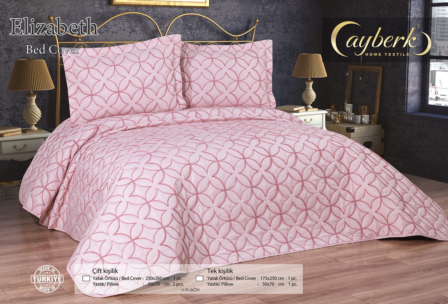 Elizabeth Yatak Örtüsü Kadife Nakışlı Pamuk Kumaştan Üretilmiştir YATAK ÖRTÜSÜ: 250*260cm 1 ad. YASTIK KILIFI : 50*70 cm. 2 ad. TOPLAM: 3 PARÇALI