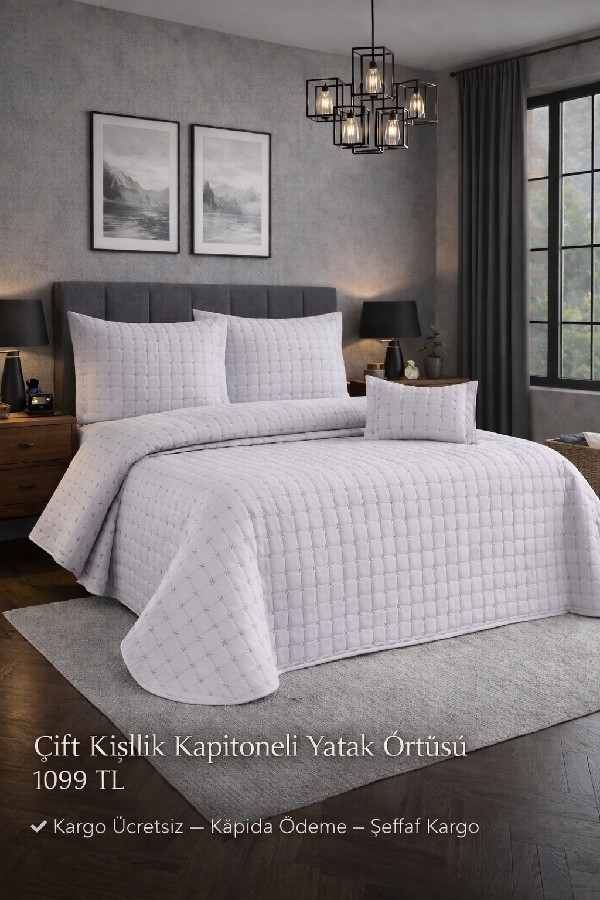 Handan Çift Kişilik Kapitoneli Yatak Örtüsü Pamuk mikro Kumaştan Üretilmiştir. YATAK ÖRTÜSÜ: 250*255 cm 1 ad. YASTIK KILIFI : 50*70 cm. 2 ad. KIRLENT KILIFI: 30*50 cm. 1 ad. TOPLAM: 4 PARÇALI Özel çantası ile birlikte