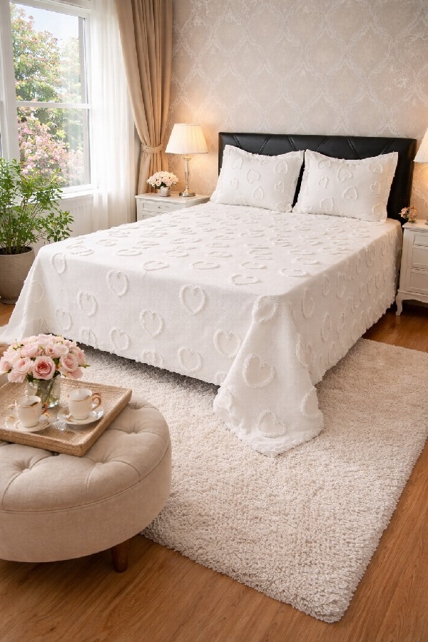 Pike: 240 x 250 cm • Yastık Kılıfı: 60 x 80 cm (2 adet) • Kalp dokulu, romantik tasarım ❤️ 🚚 Kargo Ücretsiz 📦 Şeffaf Kargo ⚡ Hızlı Kargo 💳 Kapıda Ödeme Seçeneği